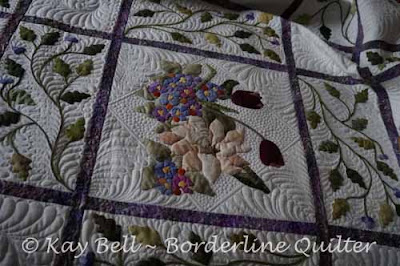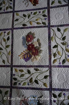 It's a huge 114" by 88" with 31 leaf blocks, 12 applique flower blocks, 30 of the plain wreath blocks and sashings. All of the sashings and applique flowers blocks were stitched in the ditch to give the flowers more of a 3D look. I feathered the skinny stems and leaves and freemotion, handguided the feathered wreath blocks. White Metro thread with magnaglide bobbins and Hobbs Wool wadding supplied by Rita. All stitch in the ditch carried out with Monopoly and magnaglides. Rita requested that I machine attach the binding ready for her to hand stitch to the back, that's what I call a half binding if you would like me to do that for your quilt. I'll update with pattern information once I get some, forgot to ask this morning.